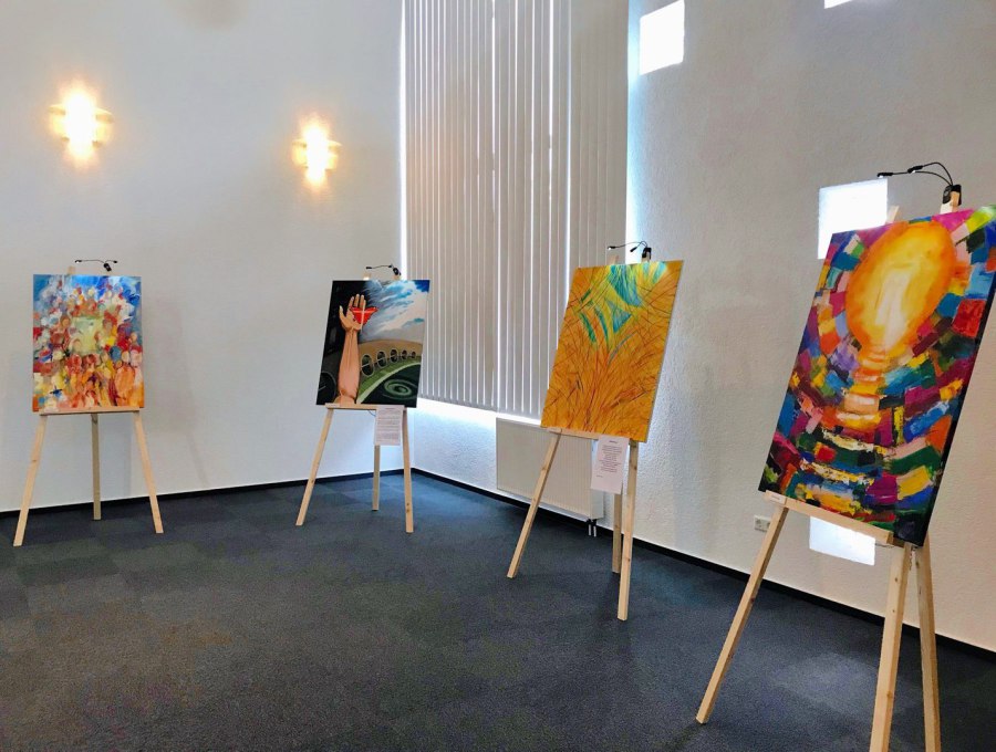 Eine der Attraktionen der Veranstaltung am „Tag der offenen Tür“ vom 05. – 12.09.2021 war die Kunstausstellung CREDO, die wir in Partnerschaft mit dem Verein KUNST + GLAUBE durchführen konnten. Auf einer weitläufigen Fläche konnten über 300 Besucher 12 Gemälde von verschiedener Künstlerinnen und Künstler betrachten, die gerade durch ihre unterschiedlichen Stilrichtungen faszinierten. Jedes Gemälde hatte eine der Hauptaussagen aus dem CREDO zum Thema. Unterstützend kam ein Leporello mit den Texten vom Glaubensbekenntnis zum Einsatz, die ergänzt wurden mit Liedstrophen aus der CD „CREDO – Das Glaubensbekenntnis in Liedern“ von Jochen Rieger. Die Besucher konnten auf diese Weise ein Zusammenspiel von Bild, Wort und Klang erleben.