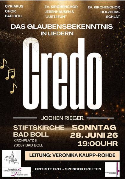 CREDO-Konzert mit drei Chören CREDO - Das GlaubensbekenntnisKonzert Termin Details Datum: 28.06.2026Uhrzeit: 19:00 - 21:00 Uhr Ort: Stiftskirche, Kirchplatz 8, 73087 Bad Boll